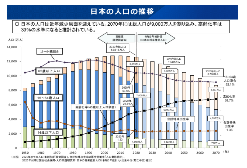 日本は世界でも有数の高齢化社会です。2020年の高齢化率は28.6%で、2070年には38.7%となる見込みです。高齢者が増えると、障がいや疾患の影響で介護を必要とする人の割合も増えることから、介護ニーズの増加が予測されます。