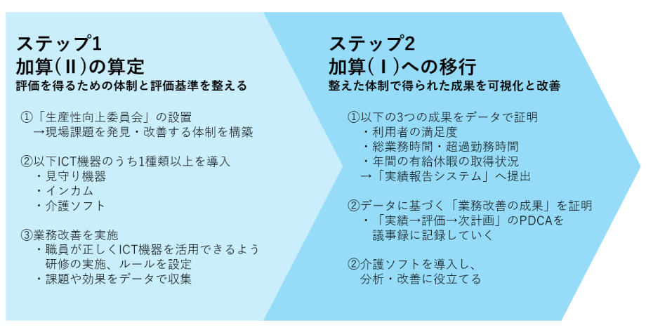 【特養・老健向け】生産性向上推進体制加算(Ⅱ)(Ⅰ)の違い、(Ⅰ)取得へ向けた実践ロードマップ