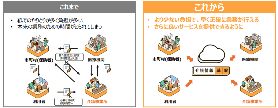 こうした従来のやり方は、時間も労力もかかる非効率な方法です。そこで検討されたのが、介護事業者・市町村・医療機関・利用者が保有する介護関連情報を一元化し、円滑に共有できる仕組みです。