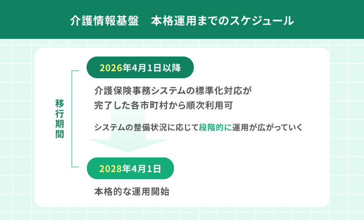 本格的な運用開始は2028年4月1日の予定です。2026年から2028年にかけての期間は、各市町村が順次対応を進め、その進捗に応じて、介護事業所や医療機関が介護情報基盤の利用を開始していく「移行期間」といえます。