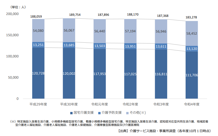 高齢化により、介護サービスの利用者は増える一方で、ケアマネジャーの担い手が十分に確保できていないのが現状です。実際に厚生労働省の調査によると、令和4年度のケアマネジャーの数は183,278人で減少傾向にあります。