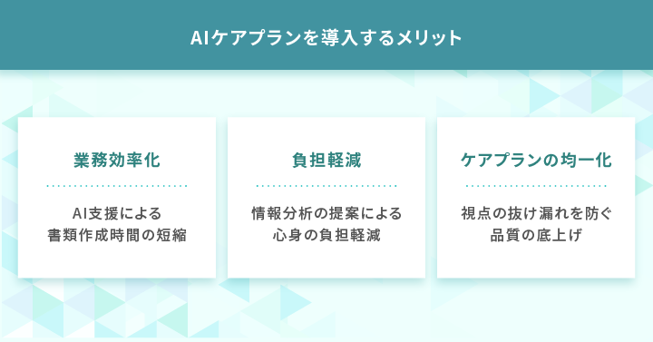 AIケアプランも同様で、導入することで得られる主なメリットは次の3つです。