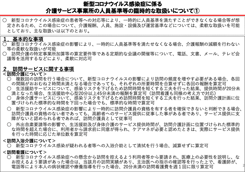 居宅介護支援では、令和2年2月28日の通知で、サービス担当者会議について、やむを得ない理由がある場合については、利用者の自宅以外での開催や電話・メールなどを活用するなどを可能とした。これは運営推進会議なども同じ規定である。令和2年3月6日には、やむを得ない場合は、訪問サービスで、訪問介護以外の職員を担当させることが出来る。デイサービスに勤務する訪問介護員の資格のない職員も、訪問介護員として従事して差し支えないとした。デイサービスが利用者の居宅を訪問して、清拭による介助を行った場合、デイサービスとして介護報酬を算定して入浴介助加算も算定出来る。
