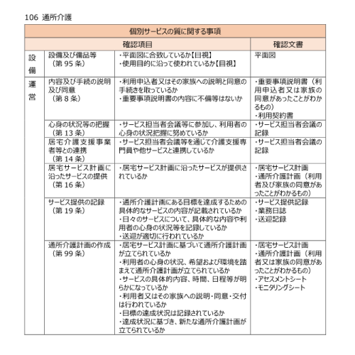 運用指針のポイントは、通知の中で示された別紙「標準確認項目」及び「標準確認文書」に基づいて実施されることだ。従来は、訪問介護、通所介護、介護老人福祉施設、居宅介護支援事業所、認知症対応型共同生活介護、介護老人保健施設、訪問看護の7種類のサービスのみであったが、3月31日に発出された「介護保険施設等運営指導マニュアル」で全サービスが網羅された。