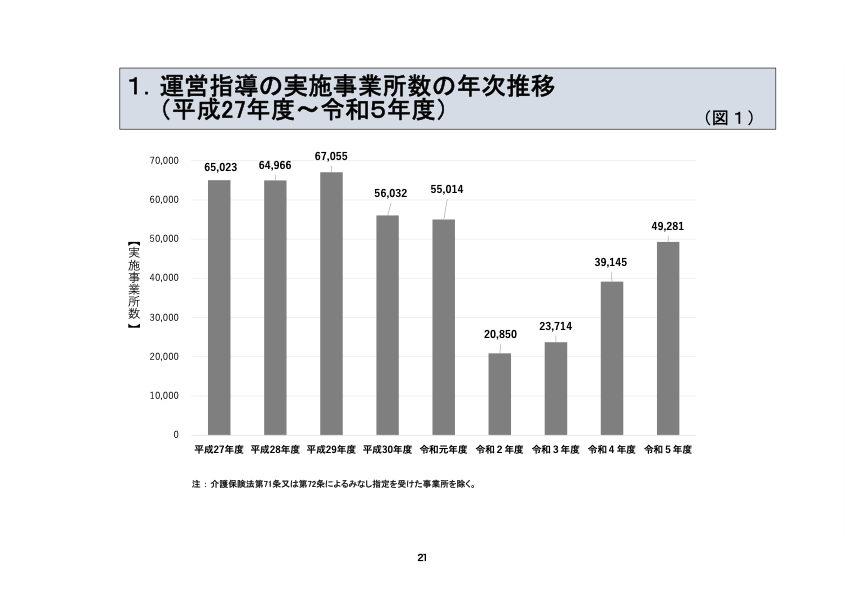 この指導件数の増加は、コロナ禍で指導が滞っていた期間の巻き返しを意味するものであり、特に在宅サービスでは「6年に1回以上」、施設系サービスでは「3年に1回以上」という目安の指導頻度が守られていなかった事業所は、いつ指導が来てもおかしくない状況にある。