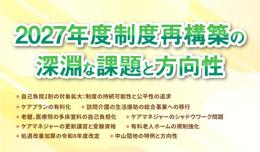 社会保障審議会介護保険部会の審議は、終盤を迎えており、12月20日頃には、意見書が取りまとめられて審議が終了する。その一部は、来年の通常国会に改正介護保険法案として提出される。しかし、多くの項目は、その方向性が示されるに留まる。具体的な内容や基準などは、来春から始まる、介護給付費分科会での審議において確定する。過去最大規模の制度改正が見込まれる2027年に向けて、しっかりと情報を得る努力が不可欠である。