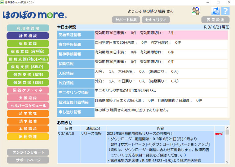 システムを開くだけの画面ではなく、「情報の入り口」として活用。本日の状況も一目で把握できます。